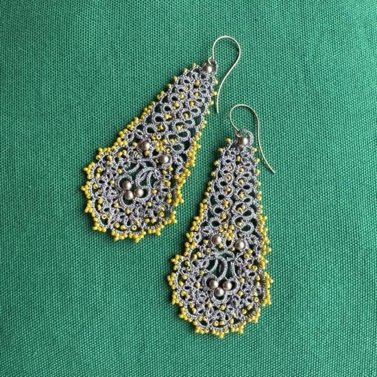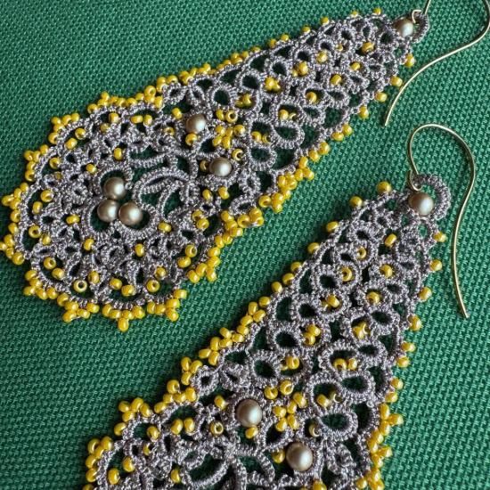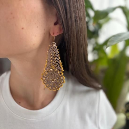タティングレースの編み方を活かした全て手編みのレースアクセサリー。大きさがあるので耳元にインパクトはもたらすのに優しくて可愛い元気なミモザ色で様々なファッションに合わせやすく、Tーシャツなどと合わせてのデイリー使いにはもちろん、結婚式やパーティー、ちょっとしたお出かけにも大活躍するアイテム!存在感もあり、エレガントさも欲しい方へおすすめのピアス/イヤリング☆