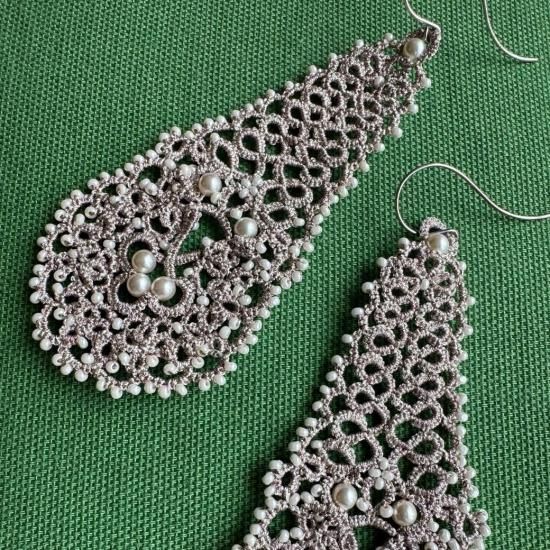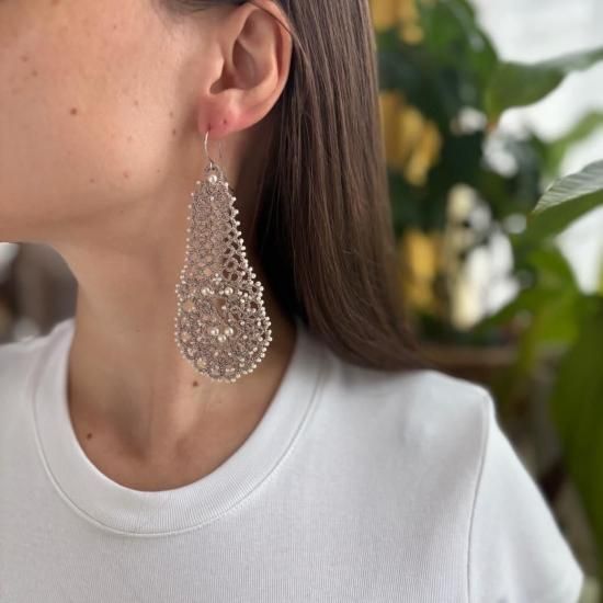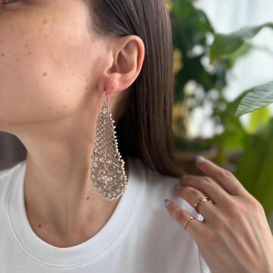 タティングレースの編み方を活かした全て手編みのレースアクセサリー。大きさがあるので耳元にインパクトはもたらすのに優しいアイボリー色で様々なファッションに合わせやすく、Tーシャツなどと合わせてのデイリー使いにはもちろん、結婚式やパーティー、ちょっとしたお出かけにも大活躍するアイテム!存在感もあり、エレガントさも欲しい方へおすすめのピアス/イヤリング☆