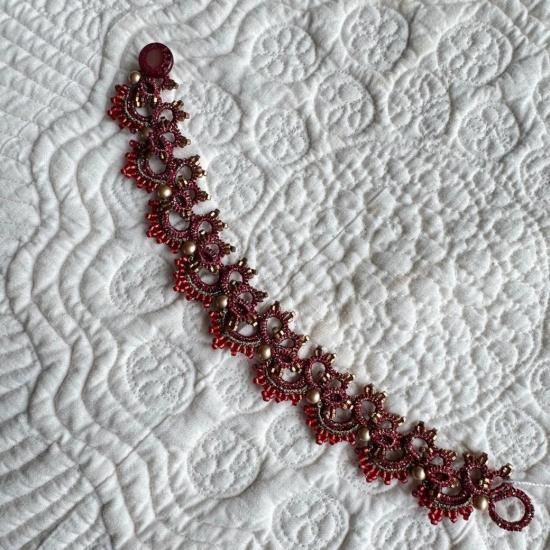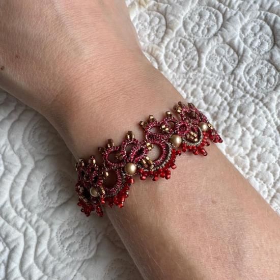 タティングレースの編み方を活かした全て手編みのレースアクセサリー。パッション(情熱)の国、フランスらしいフレンチエレガンスが引き立つ、ルージュとゴールドが引き立つおしゃれなレースブレスレット☆デイリー使いにはもちろん、パーティー、ちょっとポイントで手元を引き立たせたい時にパーフェクトなブレスレット!赤色は自信にも繋がりますのでパワーが欲しいときのアクセサリーにもとってもおすすめ!存在感もあり、エレガントさも欲しい方へおすすめのブレスレット☆