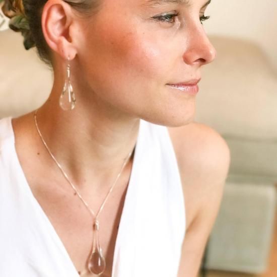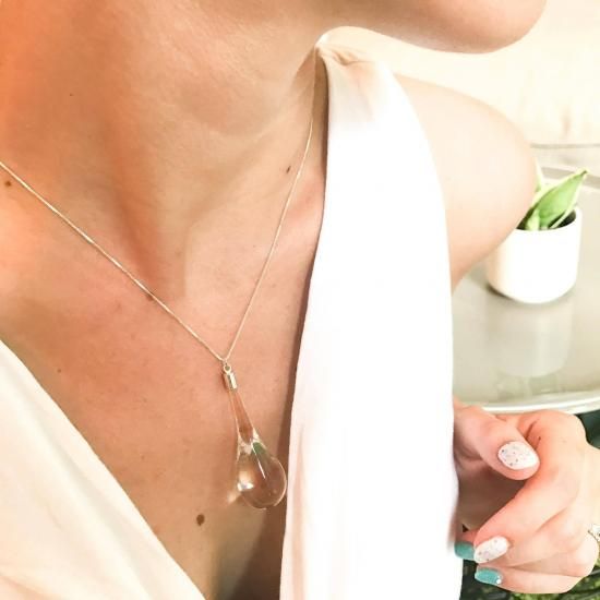 グットゥ・ペンダントは、透明感がすっきりと合わせやすい柔らかい縦ラインで仕上げたしずく型のクリアガラスのペンダント。見た目よりも遥かに軽くて丈夫です。ホワイトやアイボリー、ブラックはもちろん、柄物のお洋服ともパーフェクトマッチする万能ペンダント。夏はもちろん、オールシーズンお楽しみいただけて、カジュアルやフォーマルな場でも大活躍します。着けているだけでリフレッシュできるシックな印象のアクセサリーです。