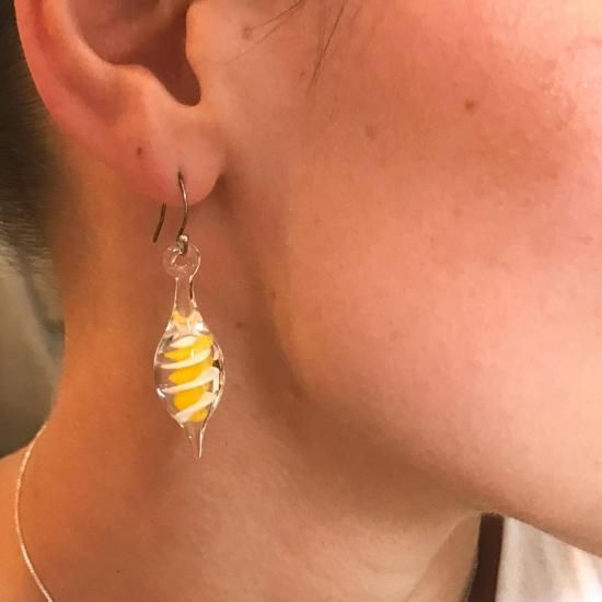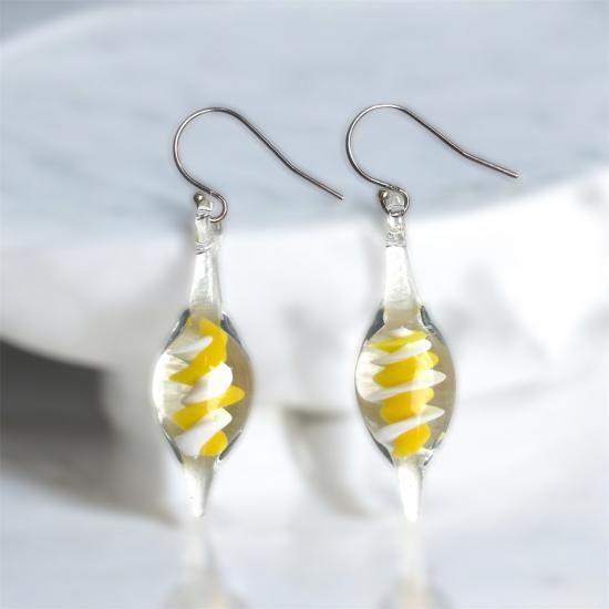 ツイストピアスのジョンヌ&ブランは、すっきりとした縦ラインを意識したクリアガラスの中にリゾート感をフルで感じさせてくれる爽やかなホワイトとトロピカルイエローカラーガラスをツイストスパイラルテクニックで封じ込めたデザイン。