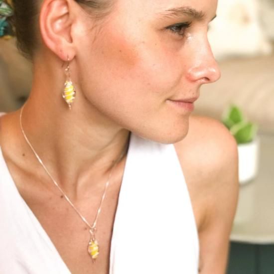 ツイストピアスのジョンヌ&ブランは、ガラス工芸部門においてフランス国家最優秀職人賞(M.O.F.)を受賞したガラスアーティストの作品。すっきりとした縦ラインを意識したクリアガラスの中にリゾート感をフルで感じさせてくれる爽やかなホワイトとトロピカルイエローカラーガラスをツイストスパイラルテクニックで封じ込めたデザイン。