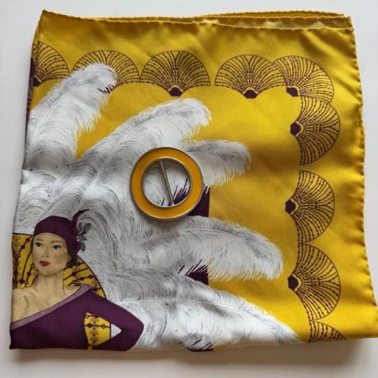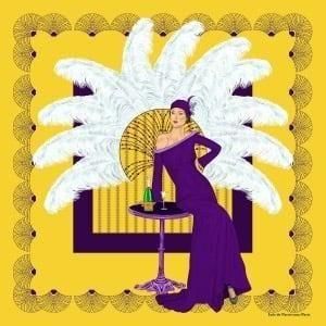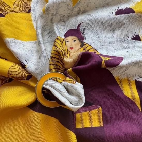Gatsby : ギャッツビー は「偉大なるギャッツビー 」からインスピレーションを得たデザインで華やかなシャンデリアのライトの下で一際目立つ華やかさをアピールしたレディーをイメージし、黄色をベースとしたスカーフに白い羽根を華やかに身に纏ったエレガントなレディーがデザインされています。黄色の差し色として羽根に白さに加えて、ドレスのパープルを加えることで、上品でエレガントなタッチをもたらすことができます。スカーフの淵にも同じ美しいパープルをセンスのモチーフのように持ってくることでその頃の貴族のアクセサリーの扇子にもウィンクを持ってきており、ゴージャス感のあるデザインに仕上がっています。