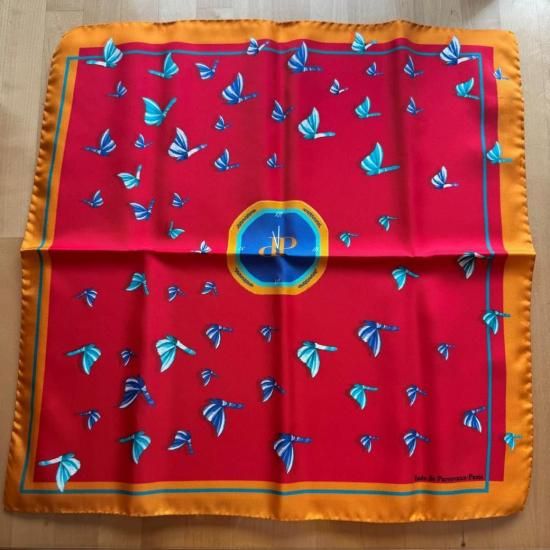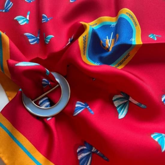 Papillons : パピヨンは「自然の中で自由に飛び回るイメージ」からインスピレーションを得たデザインで華やかな場でもデイリーの自然な場でもどんな時でも「自分らしさ」を忘れることなく自由に生きることの大切さを思い出させてくれるデザイン。赤色の美しいベースをバックに自由に象徴の青と白の羽根で飛び回る蝶。それはまるで葛藤のある中でも自由と自分らしさを忘れずに過ごして!という希望のメッセージを感じて欲しいように感じますね。力強くも首元や手元に上品でエレガントなタッチをもたらすことができます。スカーフの淵には美しくビタミンカラーのオレンジをあしらい活気のある美しいデザインに仕上がっています。