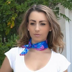 デザイナーがオススメする45x45cmのミニカレのシルクスカーフは手軽で使いやすく従来の巻き方に加えて、新感覚な着け方を取り入れるだけで楽しみ倍増します☆