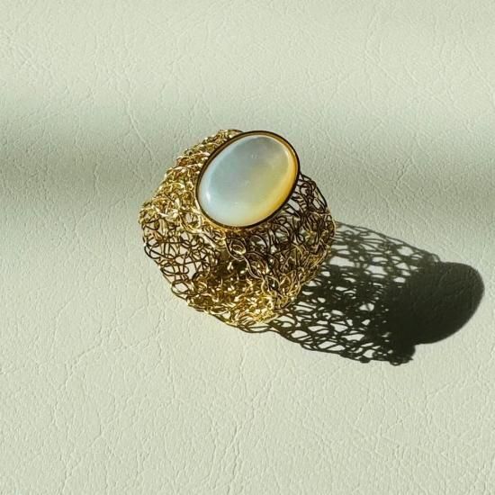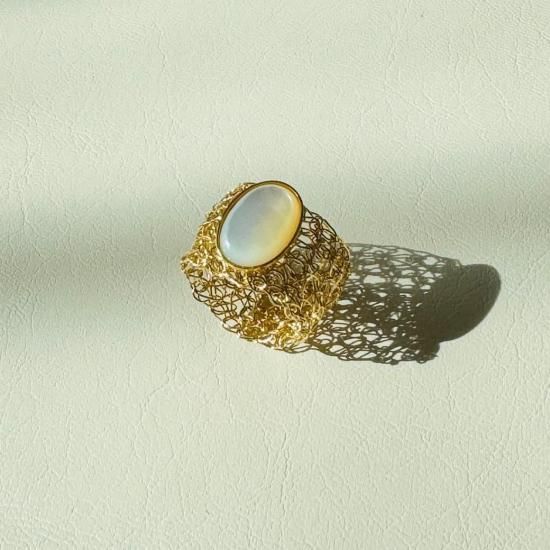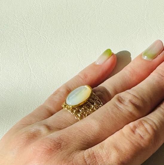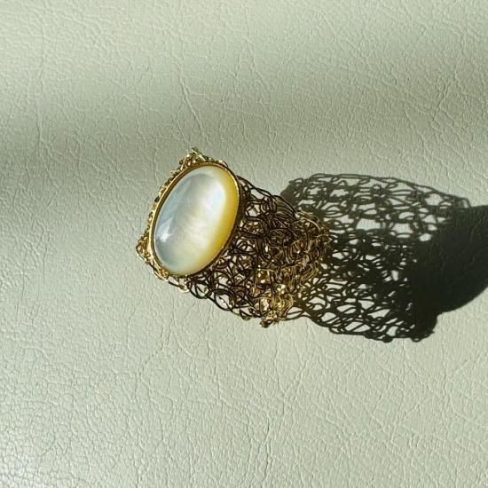 ゴールドのレーズ編みのリングの中央に大きな白蝶貝(6月の誕生石) をあしらったエレガントで優しくも格好良いリングです。「白蝶貝(しろちょうがい)は、真珠を育む貝の母貝の内側から切り出された光沢のある層を指し、宝飾・装飾素材として「マザーオブパール(Mother of Pearl)」とも呼ばれます。