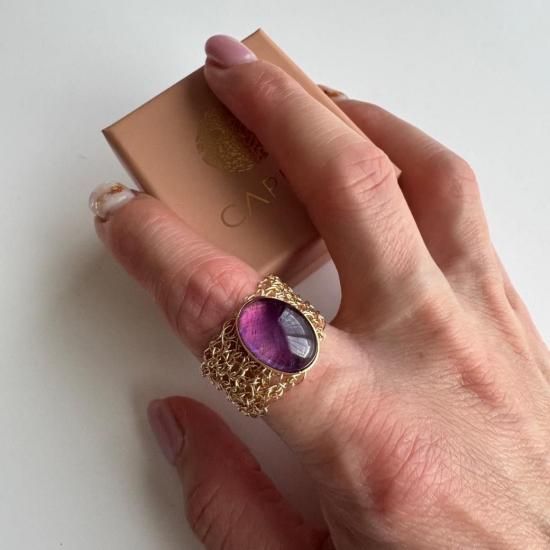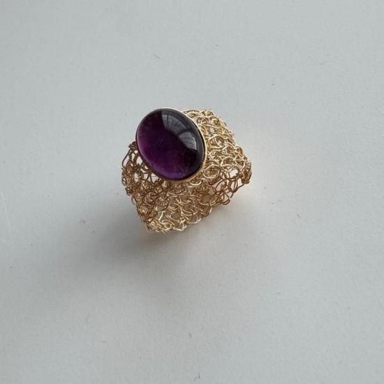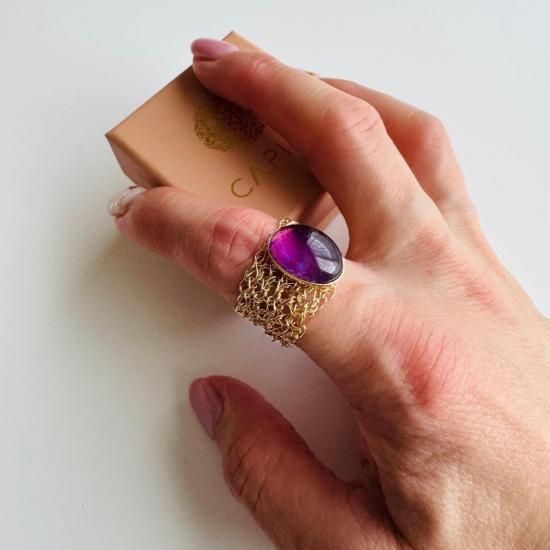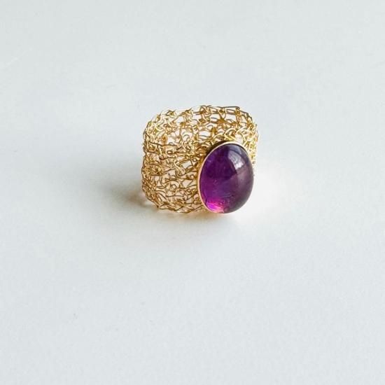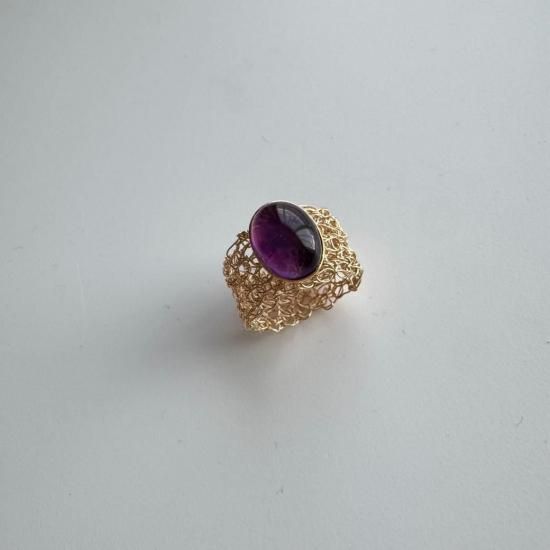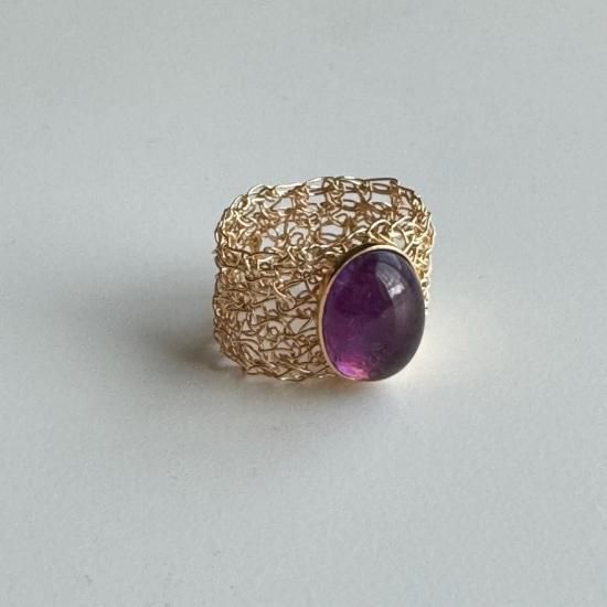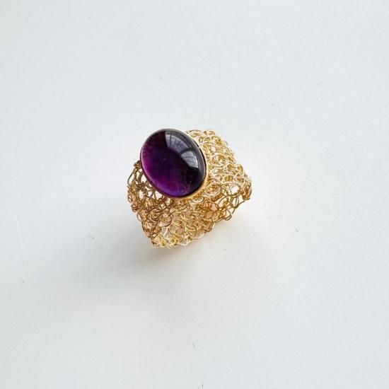 ゴールドのレーズ編みのリングの中央に大きなアメジスト(天然石/2月の誕生石) をあしらったエレガントで格好良いリングです。自然が生み出す鉱物であるアメジストは、美しい結晶構造とともにスピリチュアルな力を秘めています。 ネガティブなエネルギーを和らげ、心に余裕と落ち着きをもたらしてくれるため、ストレスが多い現代において多くの人に支持されています。 また、心をクリアに保ち、冷静な判断力を引き出すことでも知られています。