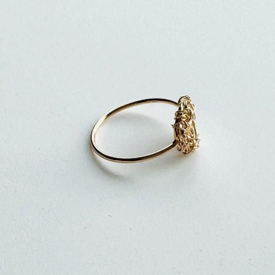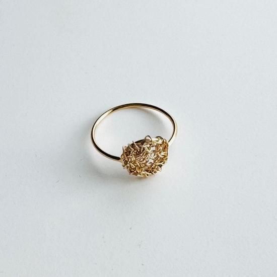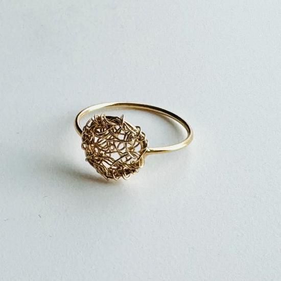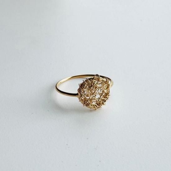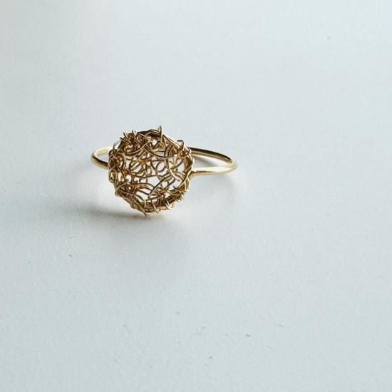 メタルの糸をレース状にクロシェットレースの技術で手とシャトルで編み上げて作り上げたメタルレースのサークル模様をイメージしたリング。